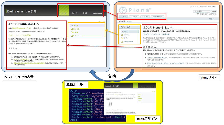 Deliverance はコンテンツ(対象サイト=Plone)のエレメントをテーマ(静的HTML)に埋め込む